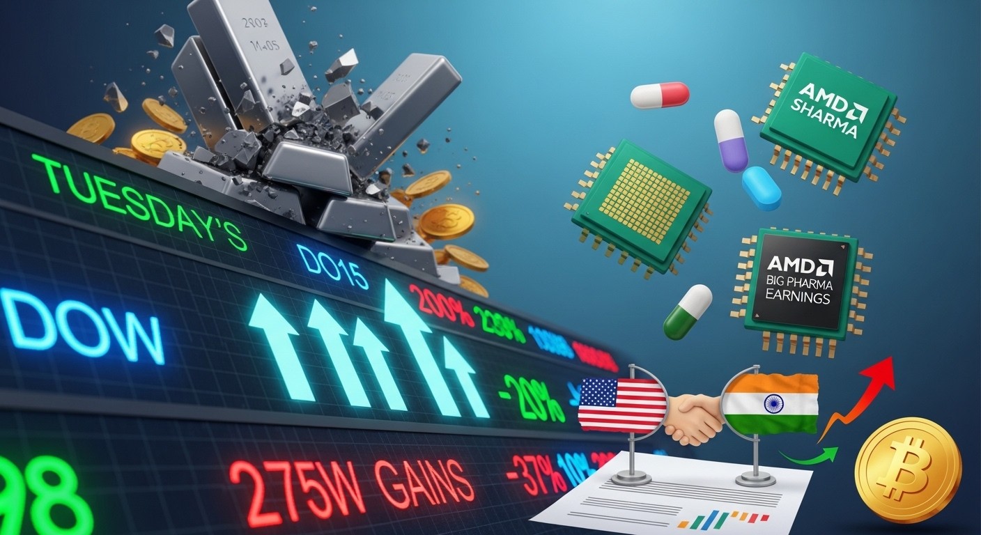 all the WP markdown in one tag.<|control12|> Tuesday’s Key Stock Movers: What to Watch in Markets Discover what could drive stocks Tuesday with big pharma earnings from Merck, Pfizer, Amgen, AMD results, silver volatility, Bitcoin moves, and fresh US-India trade deal impacts. Stock Market Movers stock movers, earnings reports, commodity volatility, India trade deal, AMD earnings market outlook, earnings season, sector rotation, commodity prices, trade agreements, silver investment, healthcare stocks Markets rallied hard Monday with the Dow up over 500 points, but Tuesday brings a packed lineup: major pharma earnings, AMD’s big report, wild silver swings, Bitcoin bouncing, and a surprise US-India trade breakthrough. Will these spark the next rally or trigger fresh volatility? Here’s what smart investors are eyeing… Stocks Market News Create a hyper-realistic illustration for a finance blog capturing Tuesday’s stock market preview. Show a dynamic stock ticker board with glowing upward arrows for Dow gains, dramatic crashing silver bars and gold coins in the background symbolizing volatility, semiconductor chips and pharmaceutical pills floating prominently for AMD and big pharma earnings, subtle US and India flags connected by a handshake over a trade document, Bitcoin symbol rebounding, vibrant blue and green color palette with red accents for tension, professional and engaging composition that instantly conveys market excitement and uncertainty to make readers click.