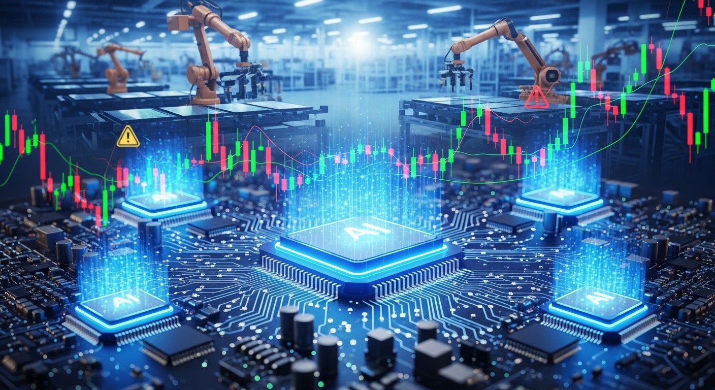 A hyper-realistic illustration showing a circuit board with glowing AI chips, stock charts overlay with rising and warning signs, semiconductor factory in background, vibrant tech colors, professional finance blog style.