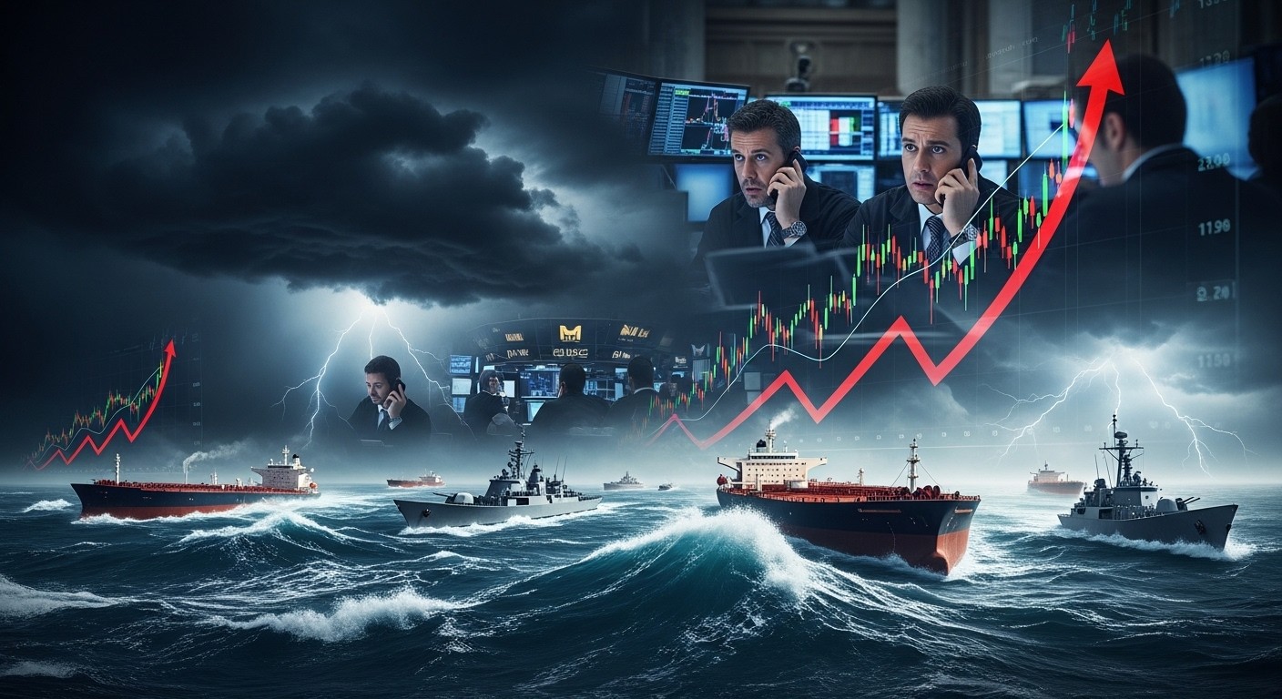 A hyper-realistic illustration showing a stormy sea in the Strait of Hormuz with oil tankers, naval ships, rising oil price charts in the background, anxious traders on a stock exchange floor, dark clouds and red arrows indicating market volatility, in a professional financial blog style with dramatic lighting.