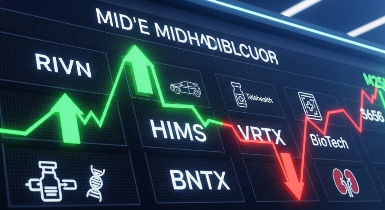 Midday market action delivered big swings in RIVN, HIMS, BNTX, and VRTX—upgrades, a major partnership resolution, founder departures, and a...